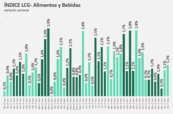 En la segunda semana de diciembre hubo un incremento en el nivel de precios de los alimentos y bebidas del 1,34% y se aceleró 0,22 puntos respecto a la semana anterior. De esta forma, alimentos y bebidas registraron una variación mensual del 3,8% punta a punta en el último mes. Verduras y Panificados aportaron 1,15 puntos a la suba total de los últimos siete días.