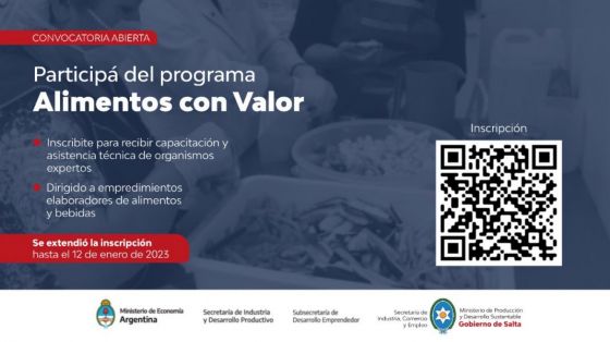 El Ministerio de Producción y Desarrollo Sustentable informa que se extendió el plazo para que elaboradores de alimentos y bebidas de Salta, se inscriban para postularse y participar del programa “Alimentos con valor”, que depende de la Secretaría de Industria y Desarrollo Productivo del Ministerio de Economía de la Nación.