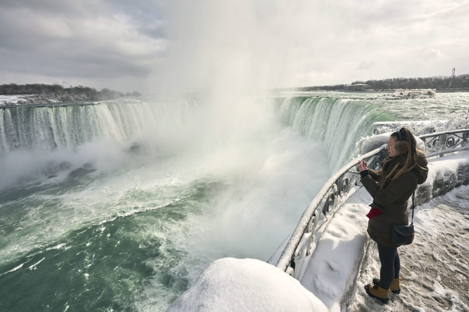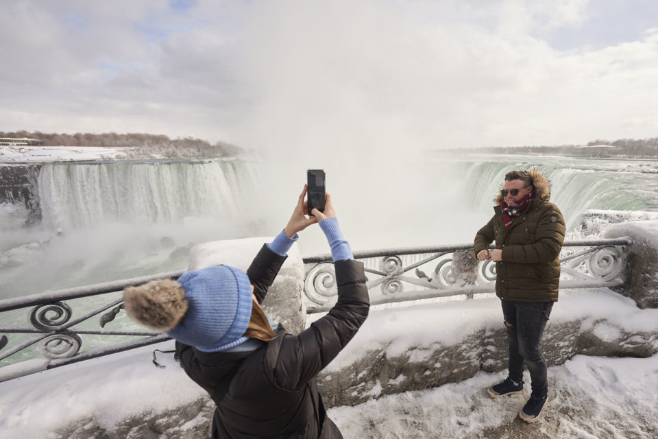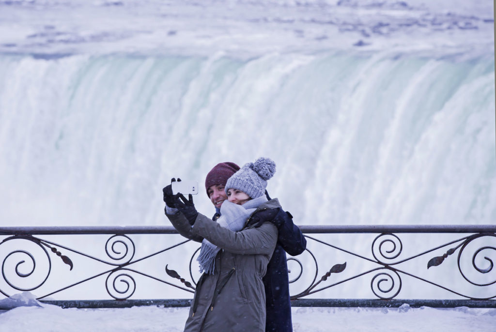 Visitors take photographs at the brink of the Horseshoe Falls in Niagara Falls, Ont., as cold weather continues through much of the province on Friday, December 29, 2017. (Aaron Lynett/The Canadian Press via AP)