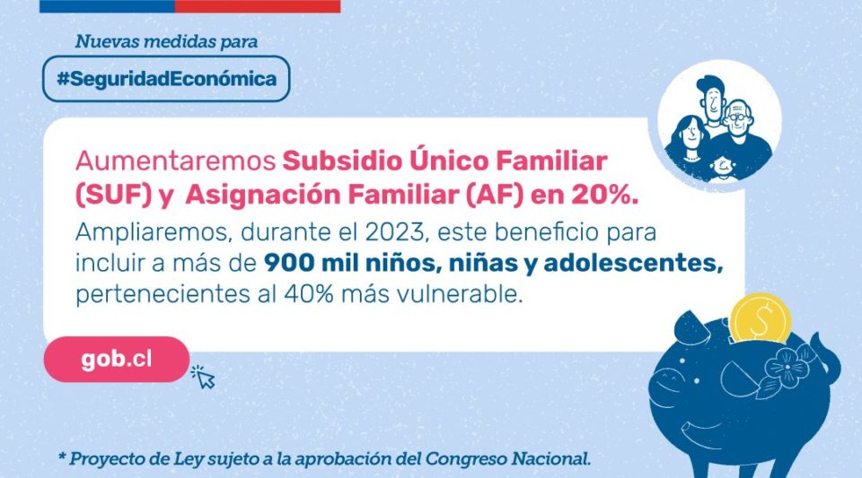Se incrementará en un 20% el monto de la Asignación Familiar (AF) y del Subsidio Único Familiar (SUF), beneficiando a más de tres millones de personas. Además, se avanzará en la automatización del SUF, para llegar a más de 900.000 niños, niñas y adolescentes pertenecientes al 40% más vulnerable de la población.
