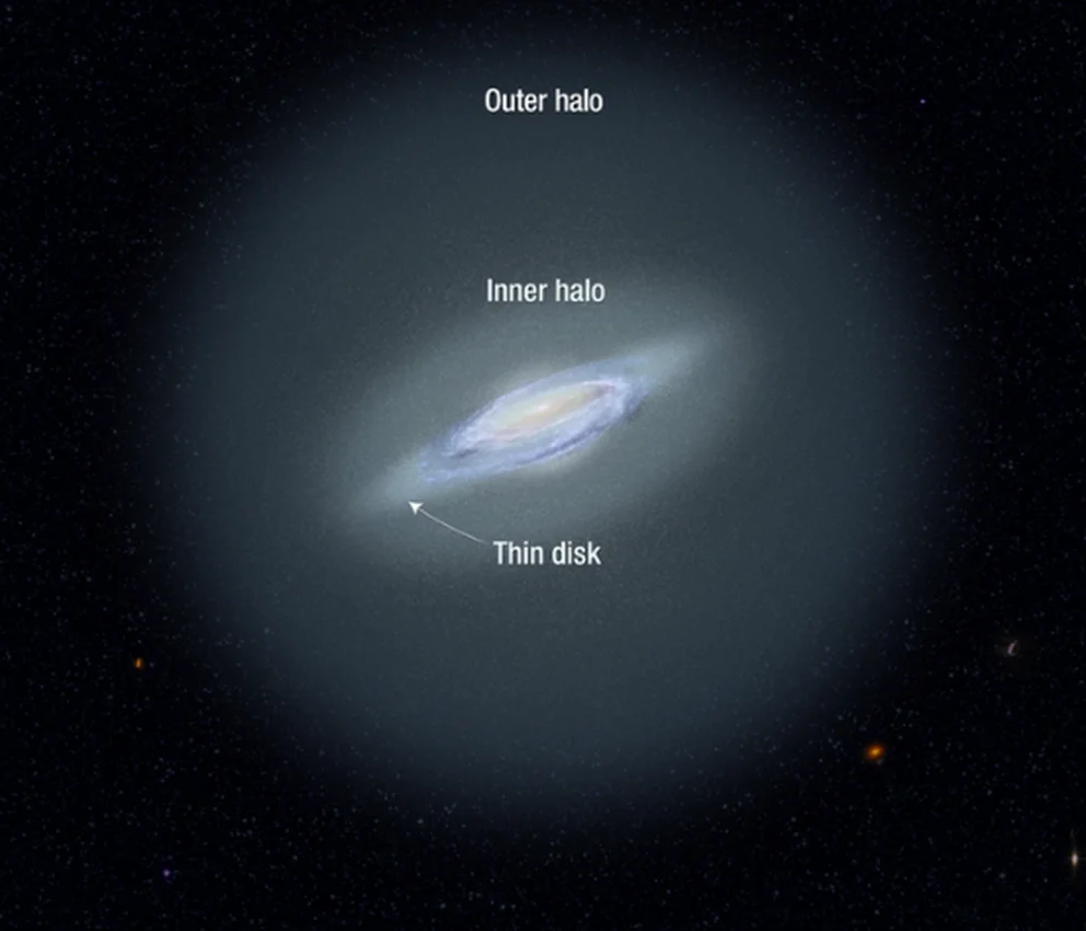 GuhaThakurta explicó que el componente del halo estelar de nuestra galaxia es mucho más grande que el disco, que tiene unos 100.000 años luz de diámetro. Nuestro sistema solar reside en uno de los brazos espirales del disco. En el medio del disco hay una protuberancia central y, a su alrededor, está el halo, que contiene las estrellas más antiguas de la galaxia y se extiende cientos de miles de años luz en todas direcciones. “El halo es la parte más difícil de estudiar porque los límites exteriores están muy lejos”, agregó. “Las estrellas son muy escasas en comparación con las altas densidades estelares del disco y la protuberancia, pero el halo está dominado por materia oscura y en realidad contiene la mayor parte de la masa de la galaxia”.