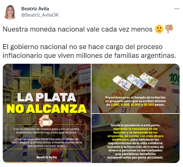 La senadora de Juntos por el Cambio por Tucumán, Beatriz Ávila, presentó el miércoles un proyecto de ley que impulsa la emisión de billetes de $ 2000, $ 5000, $ 10.000 y $ 20.000.