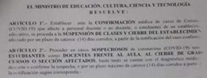 Con la firma de Matías Cánepa, Ministro de Educación de la Provincia de Salta, mediante decreto N° 98, la provincia suspenderá las clases cuando se comprobara que personal docente, no docente y/o estudiantes estén infectado con el CoronaVirus.