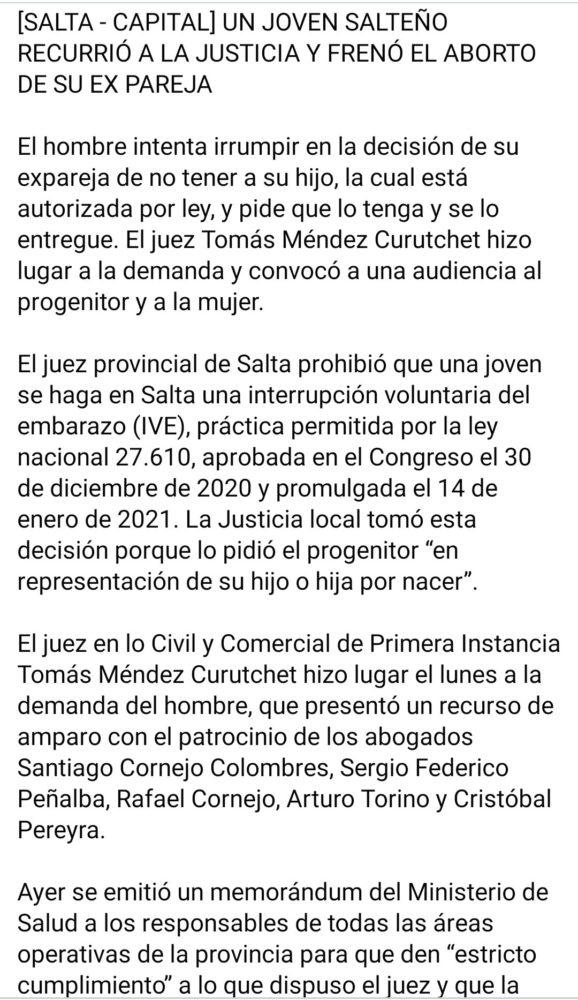 El INADI, desde su delegación Salta, expresa su profunda preocupación por la resolución dispuesta por el Juzgado en lo Civil y Comercial en Primera Instancia, a cargo del juez Tomás Méndez Curutchet. Desde el instituto creemos que la judicialización de la soberanía de los cuerpos es una reacción antidemocrática, que atenta contra los derechos humanos de las personas gestantes.