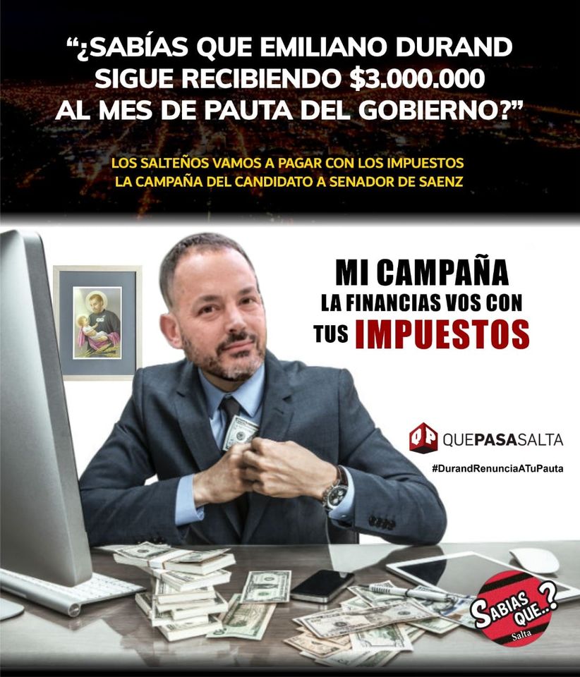 Los recursos de Durand recibidos del Municipio romerista superaban los $150 millones que embolsó a través de sus portales Que pasa Salta e Infonoa en un dudoso convenio para el “mantenimiento” de los paradores de ómnibus municipales, tarea que jamás realizó. Toda cartelería y los afiches de Emiliano los pagó el Gobierno de Bettina Romero y la administración saenzcista.