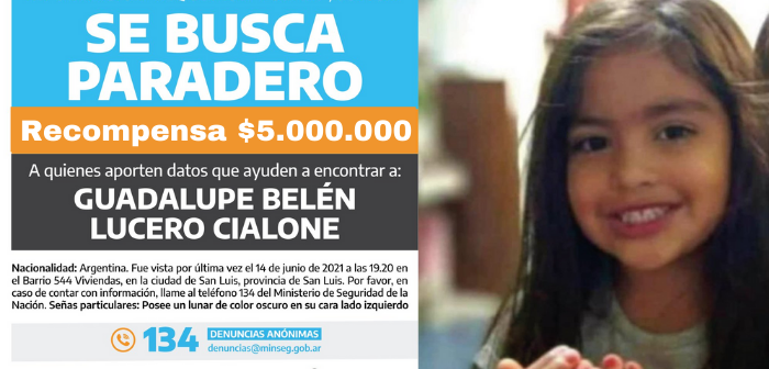 El Gobierno nacional oficializó un incremento en la recompensa para quienes puedan aportar datos útiles para dar con el paradero de Guadalupe Belén Lucero, la niña de 5 años desaparecida desde el 14 de junio último en la ciudad de San Luis.