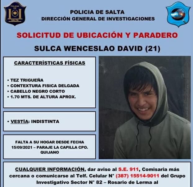 La comisión partió a las 4.30 de la madrugada luego del desesperado pedido de la madre de David, denunciando que las demoras de la Policía para iniciar el operativo. Participan en el operativo, Policía y Defensa Civil de Campo Quijano, Bomberos, Criminalística, División Canes y Policía Rural.