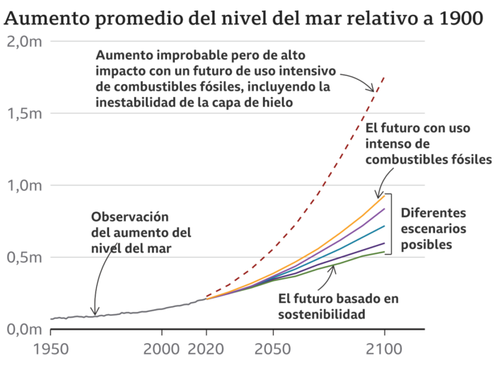 También creen que “no es posible descartar” una subida del nivel del mar que se acerque a los 2 metros a finales de este siglo.