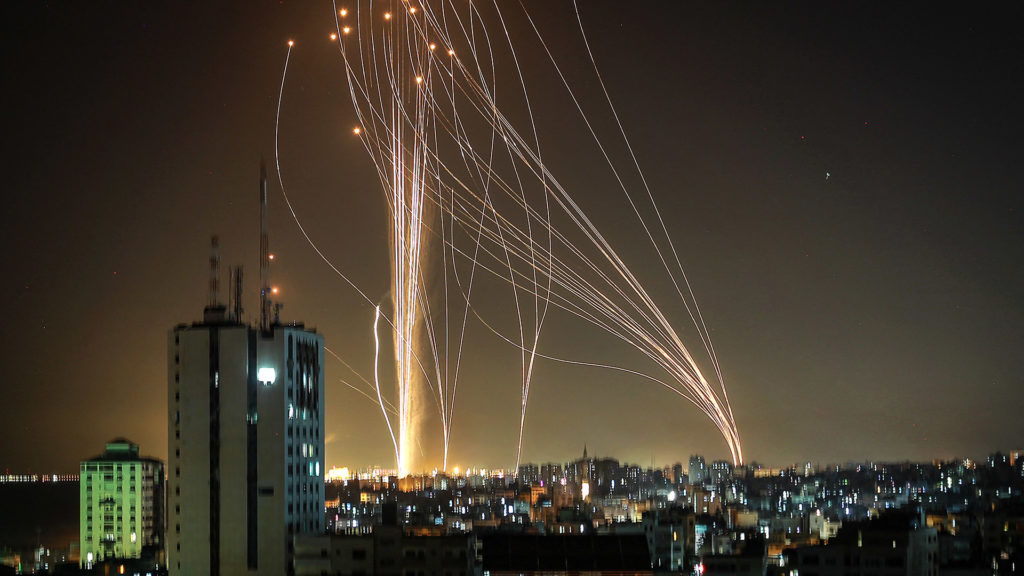 Rockets are launched from Gaza city, controlled by the Palestinian Hamas movement, in response to an Israeli air strike on a 12-storey building in the city, towards the coastal city of Tel Aviv, on May 11, 2021. (Photo by ANAS BABA / AFP)