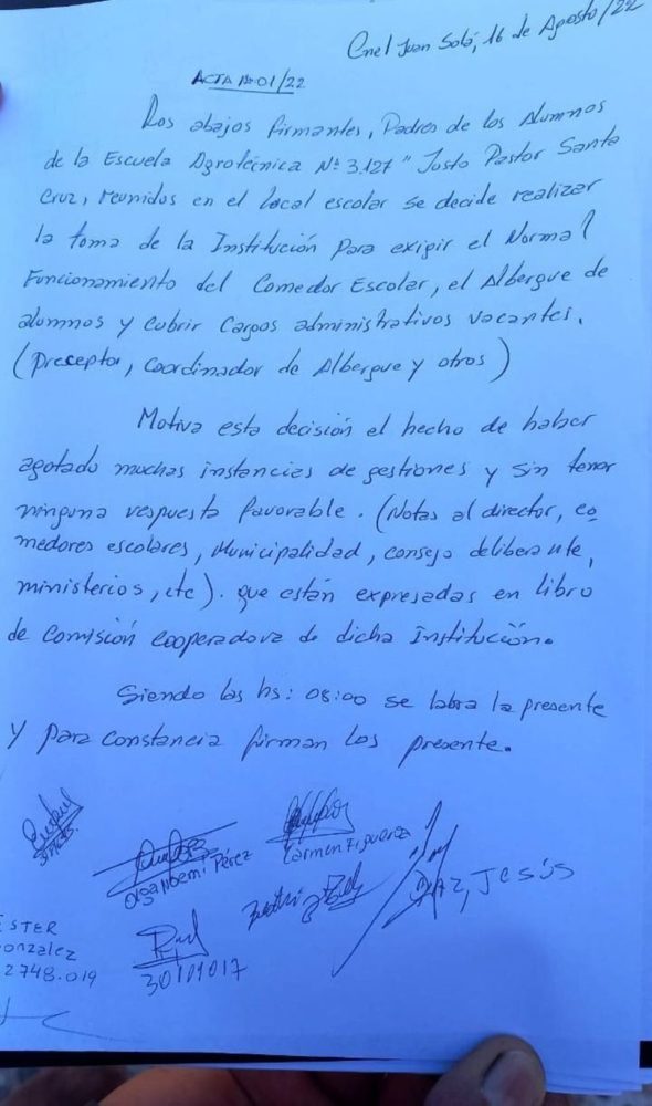 “Estamos reunidos en el local escolar y se decide realizar la toma de la institución para exigir el normal funcionamiento del comedor escolar, el albergue de alumnos y cubrir cargos administrativos vacantes, como preceptor y coordinador del albergue”, expresaron los padres en una nota.