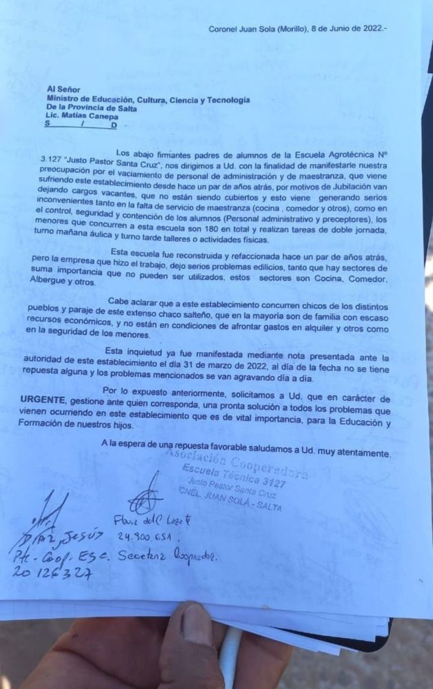 Los padres acusan que falta personal y que por tal motivo no están funcionando el comedor y el albergue, dos áreas sumamente importantes para el desarrollo de los chicos en esta zona del chaco salteño. Se sienten olvidados e ignorados ya que aseguran que desde el Ministerio de Educación no hubo respuestas. También se dirigieron a la Municipalidad local y Concejo Deliberante, donde tampoco consiguieron ayuda.