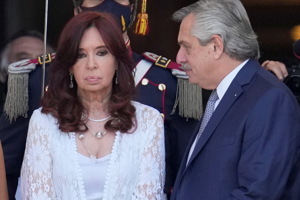Argentina's President Alberto Fernandez looks at Vice President Cristina Fernandez de Kirchner outside the National Congress during the opening session of the legislative term for 2022, in Buenos Aires, Argentina March 1, 2022. Natacha Pisarenko/Pool via REUTERS