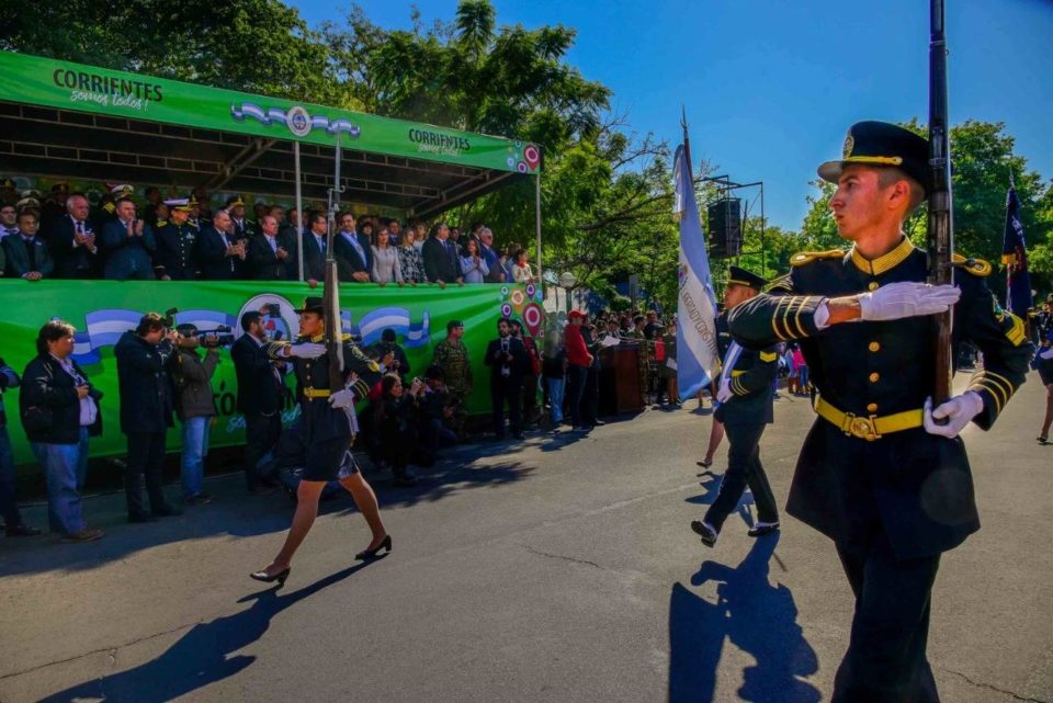 En la plaza de Armas de Yapeyú, a 400 kilómetros al sureste de la capital , junto al templete que guarda los restos de la casa de San Martín, se presenta la agrupación Libertador de los Granaderos a Caballo, tras el ingreso del sable corvo del Libertador y se esperan los discursos del gobernador Gustavo Valdés y la intendenta Marisol Fagundez, tras lo cual se iniciará el desfile cívico militar.